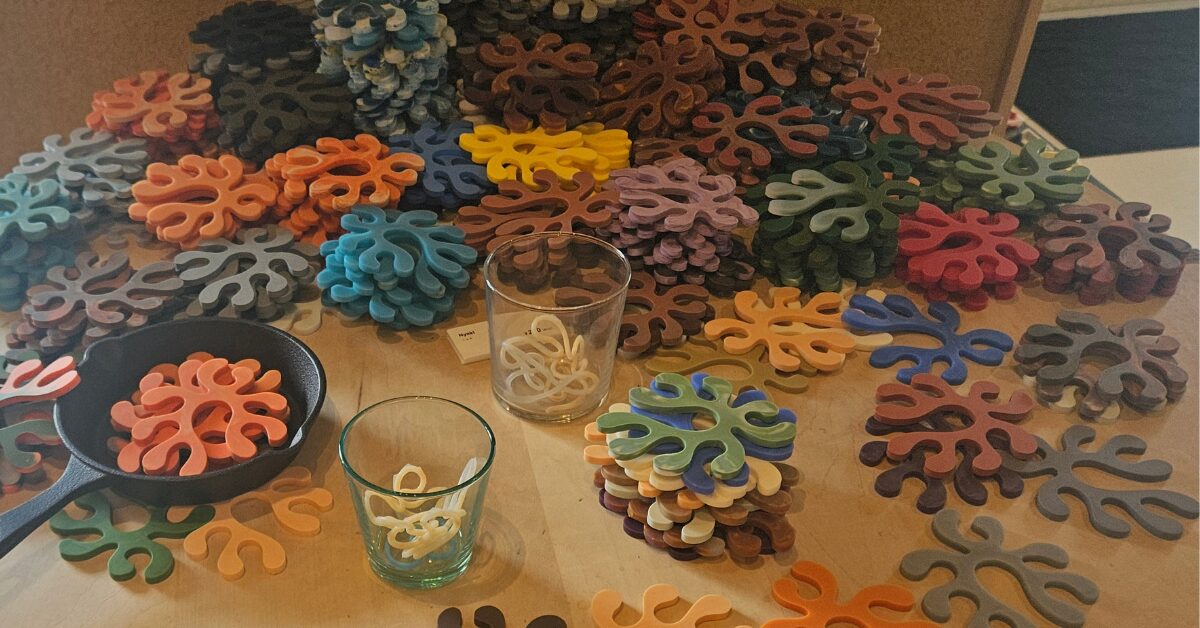 Colorful mugs, coasters, and other eye-catching silicon items are displayed — and all are available for purchase!