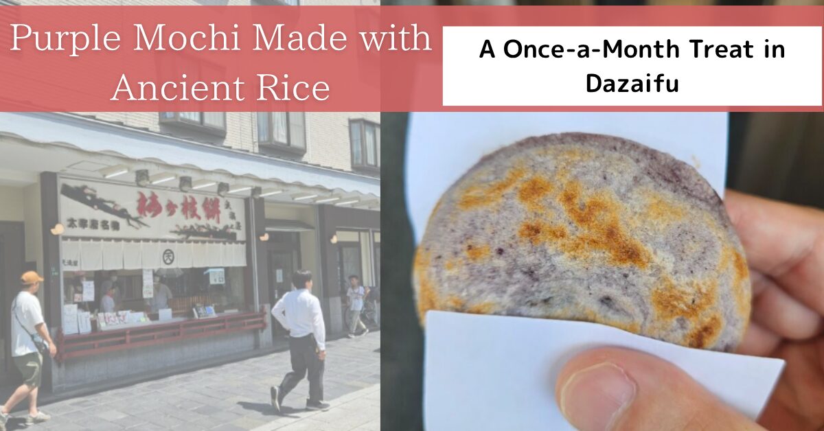 You can find the purple Umegae Mochi made with ancient rice at any shop along the approach to Dazaifu Tenmangu Shrine — the same places that sell the regular version.