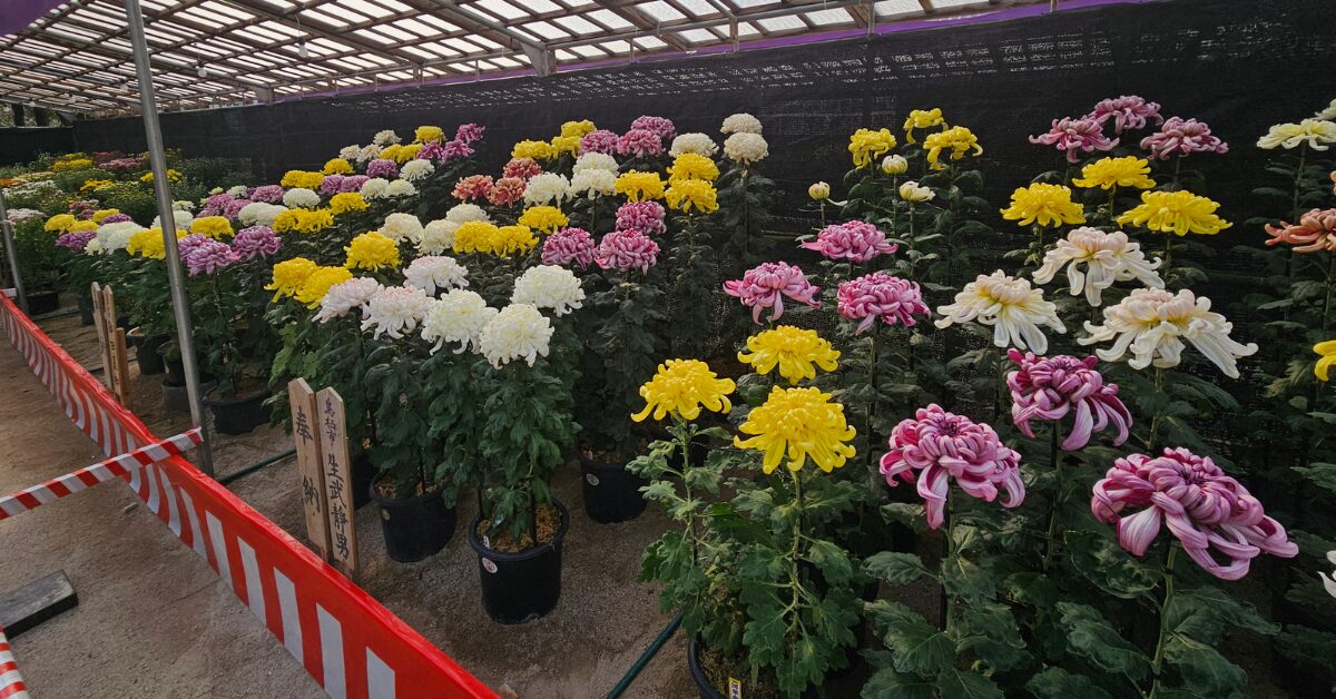 You’ll find rows of colorful chrysanthemums—large blooms, small blossoms, and the traditional Fukusuke variety—creating a stunning autumn scene.